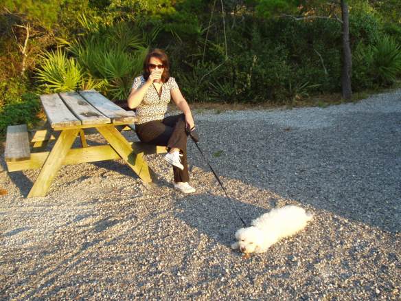 Every good tour day starts with a good cup of coffee – the stronger, the betterI Noel and our “tour manager” Dijon take in the morning air at Henderson Beach State Park.