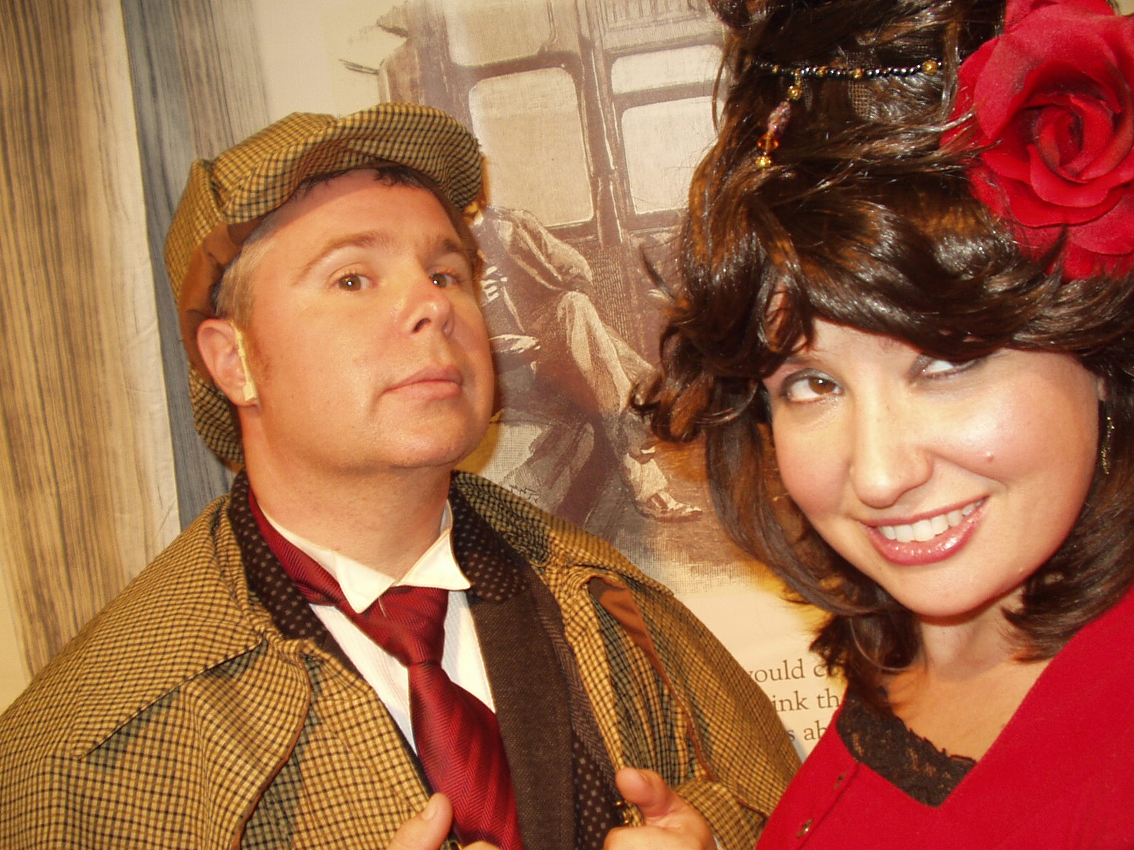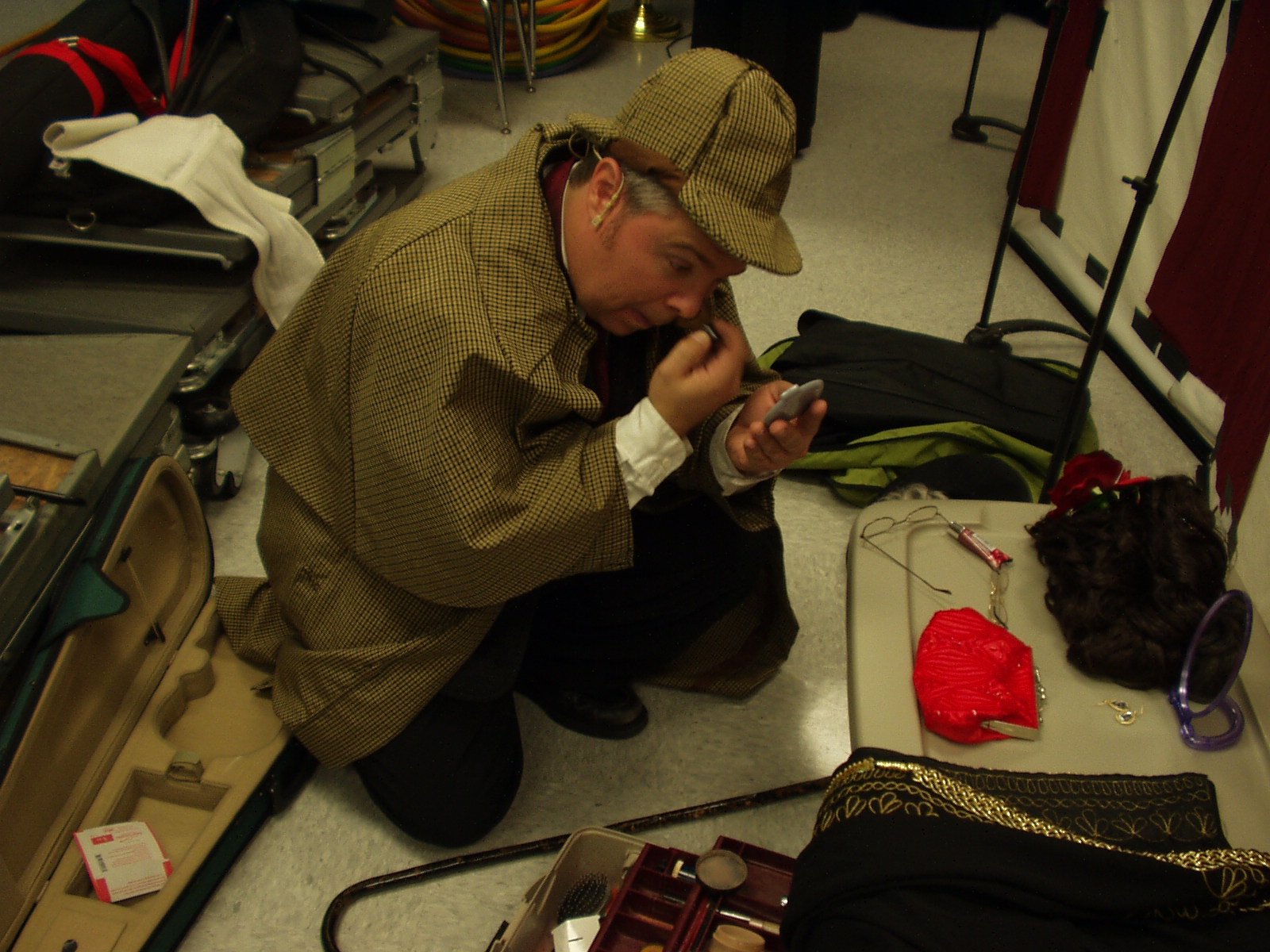 Noel has time to snap a picture backstage during the show after her costume change. On the other side of the set, Don is investigating the mystery in front of around 400 students. Sherlock Holmes always has his partner, Watson, with him. Watson is picked from the audience every day. It’s so much fun for the kids to see their classmate onstage in a bowler hat!