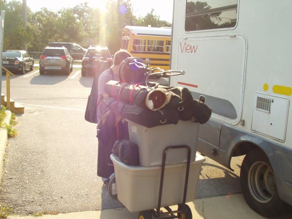 We make the drive to Destin Elementary, our first school for the day. We’ve been here many times before, so we know which spot we can squeeze the RV into so it is out of the way of the busses. The SHERLOCK HOLMES show has a lot of stuff to it. Backdrop set pieces, set furniture, sound equipment, props, costumes and a violin.