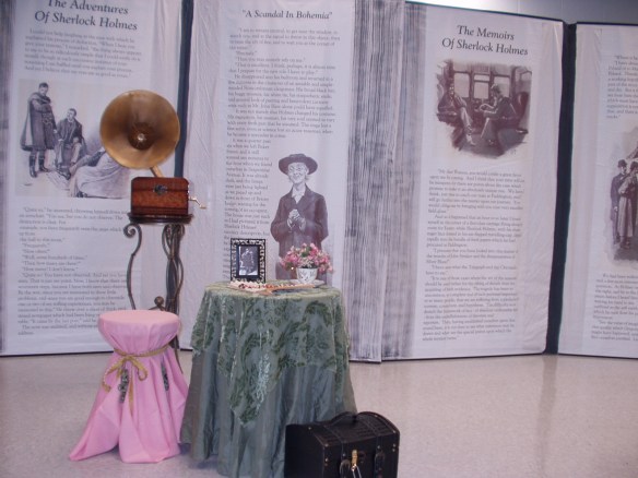 Here’s the front view of the set at Destin Elementary. This background shows large pages of the Sherlock Holmes books. We’ve heard many kids commenting about how big the books are and how much they like it while we wait backstage to begin.