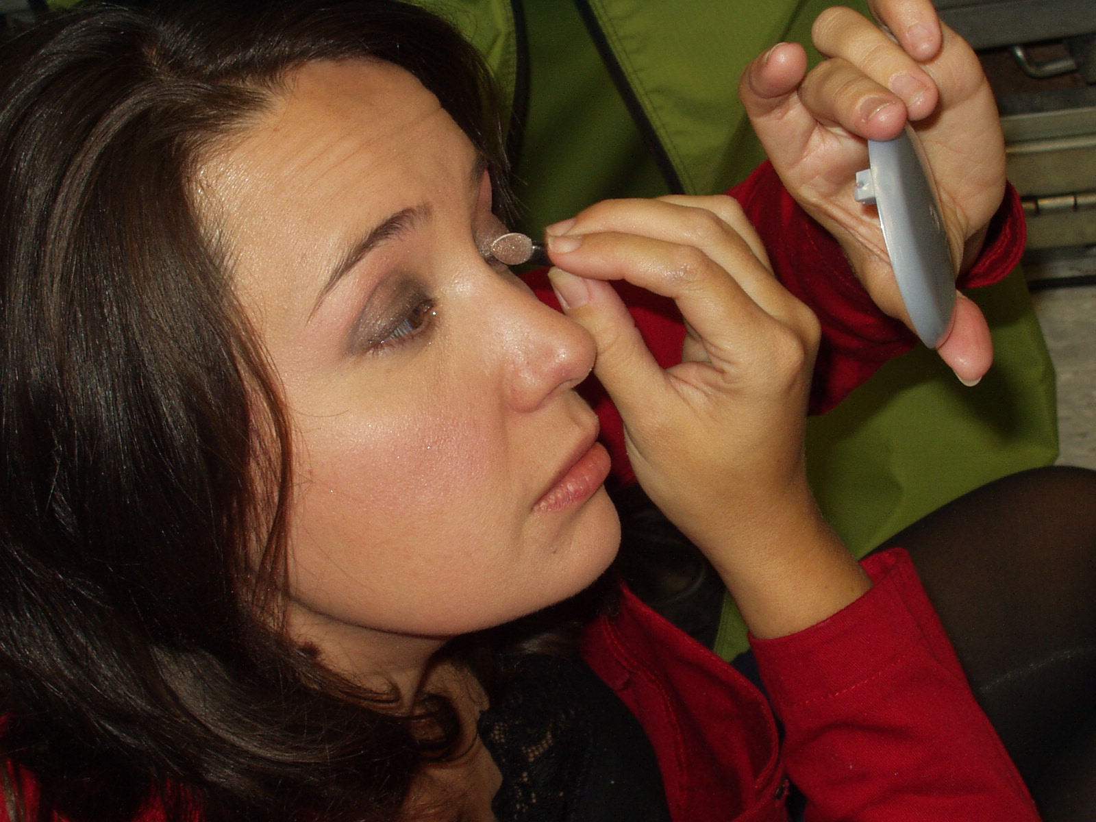 Here’s Noel getting into makeup in preparation for her two roles in the show. First, he beautiful American opera singer, Irene Adler: