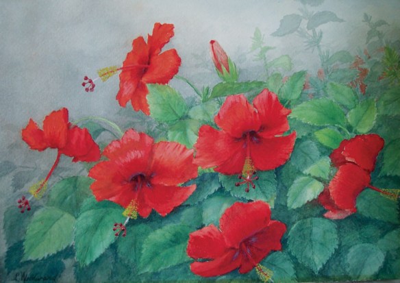 Laura Woodward, “Red Hibiscus,” watercolor, collection of Edward and Deborah Pollack. Image courtesy/used by permission of Edward and Deborah Pollack.