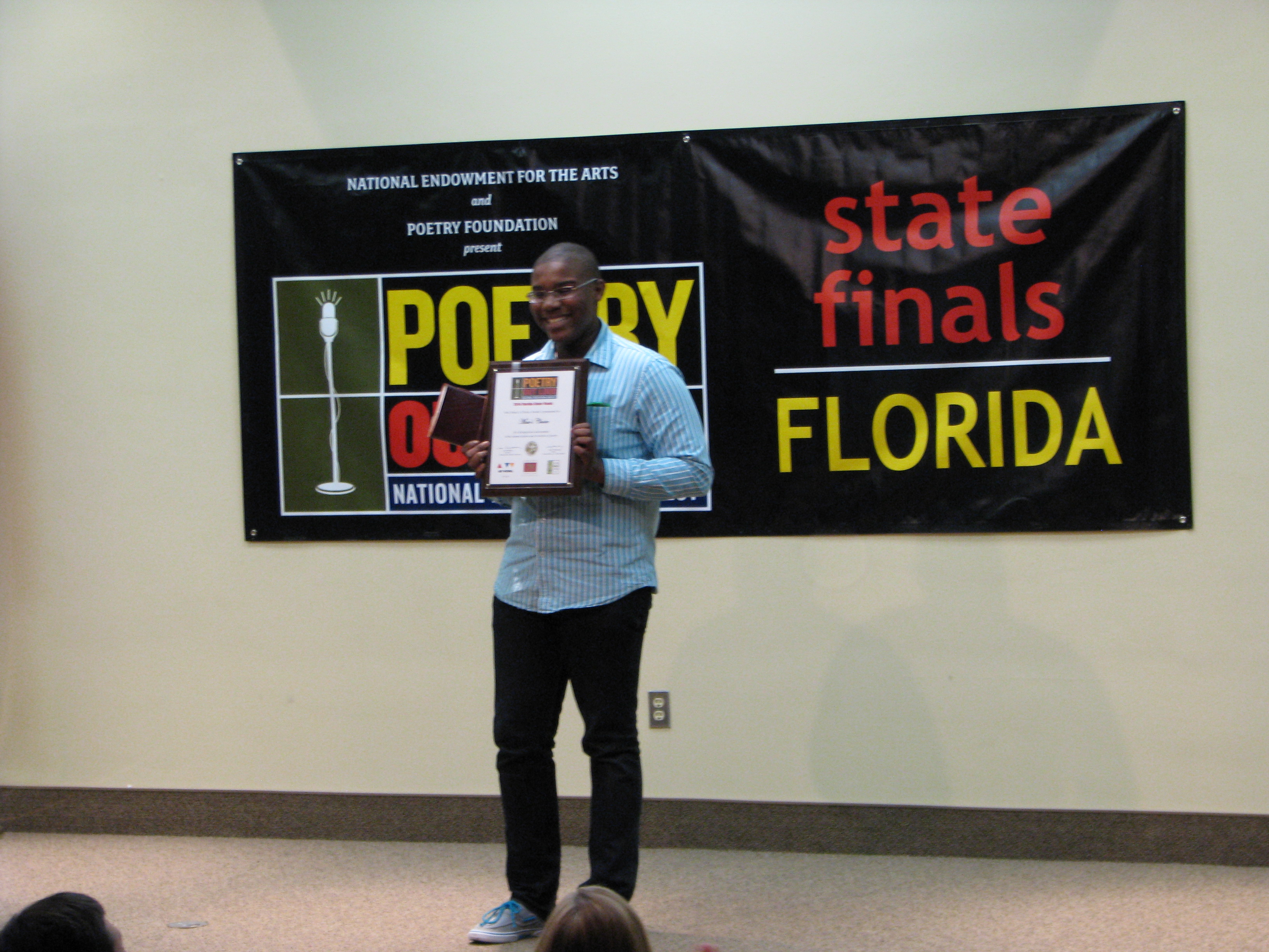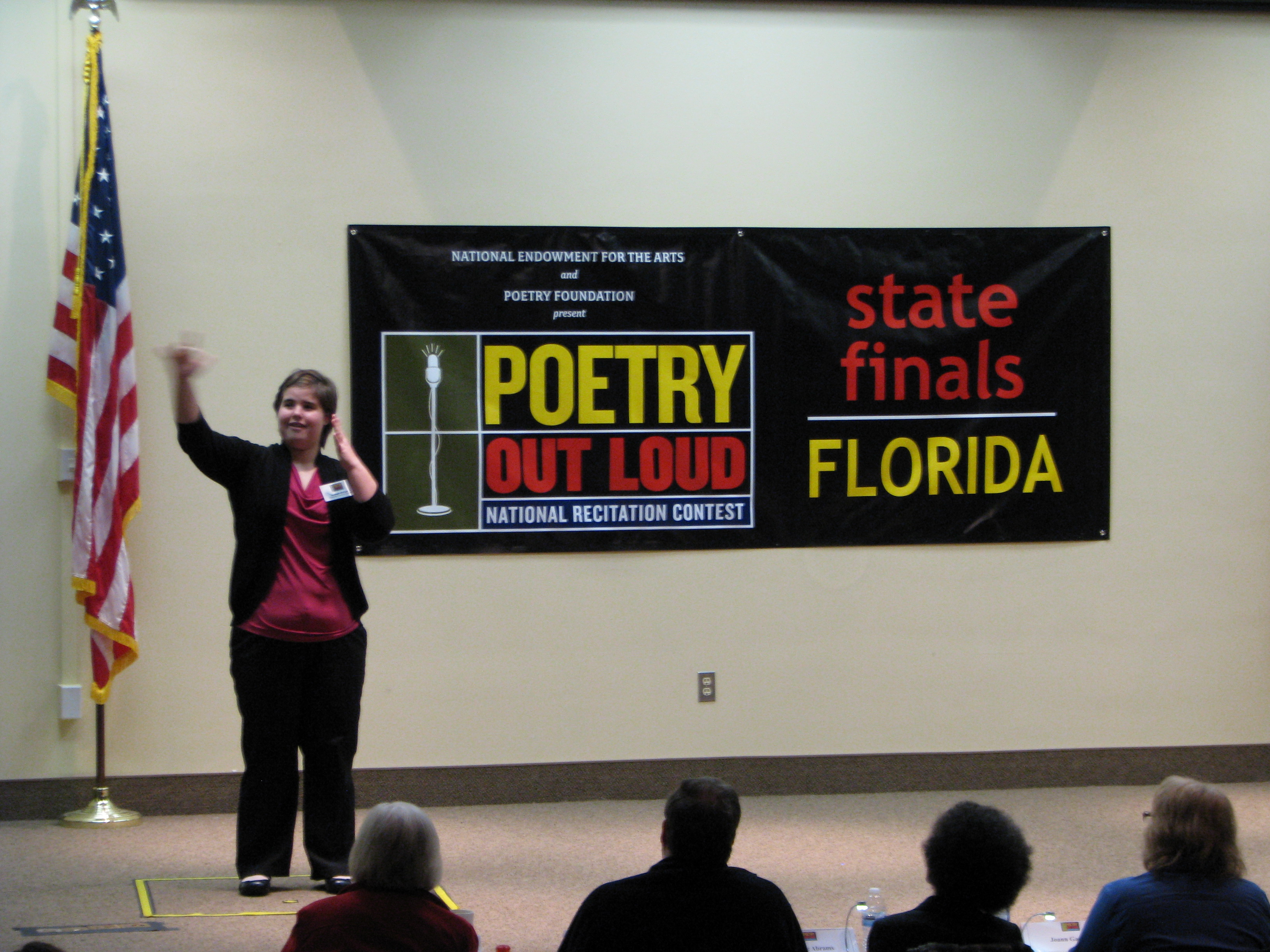 Participation in a Poetry Out Loud program begins at the classroom level. It’s easy to incorporate the program into the curriculum because Poetry Out Loud correlates with English Language Arts Standards set by the National Council of Teachers of English (NCTE). Not only does the program seek to encourage our nation’s youth to learn about great poetry through performance and recitation, it is an inclusive program. It creates an entry point for students to appreciate poetry, it reaches out to students who might not have otherwise taken to poetry or the stage, and it impacts the lives of students both academically and socially. I strongly encourage high school teachers to incorporate the program into their language arts curriculum. Schools interested in finding out more can visit the official Poetry Out Loud website, visit the Florida Division of Cultural Affair’s POL webpage, or contact me for more information. It might just be a student from your community who goes to Washington next year!