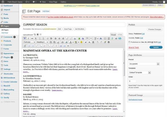 1. Website – Everyone knows that having a website is imperative to any arts organization. However, a website is only as good as how well it is managed and the quality of information contained within. A few years ago, Palm Beach Opera switched from a traditional CMS (content management system) to WordPress, an open-source CMS. This small change has revolutionized how we are able to manage our website. You may have heard of WordPress.com which is a free web-based blogging platform but WordPress can also be used to create and manage a website on your own server. Any website is a kinetic entity that should be updated often to reflect upcoming events and using a web-based open-source CMS like WordPress allows us to do that quickly and easily from any computer or device with an internet connection.