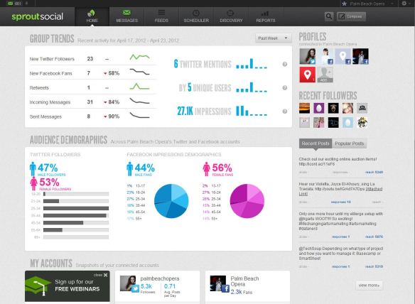 3. Social Media Management – At Palm Beach Opera, we use Facebook, Twitter, Flickr, and YouTube as our main social media platforms. (It is important to remember to only be on the social media platforms that work for your organization. Don’t feel pressured to be on too many if they don’t make sense or you don’t have time to manage them all.) It can be tough to keep up with multiple platforms especially if your organization has a small staff or the responsibility falls to one person only. To help with this, we use Sprout Social to manage social media activity. Sprout Social aggregates the activity on our social media profiles so that it can be seen in one place making it much easier to manage. It also gives stats and data so that you can have useful demographic information about your friends and followers as well as statistics about activity and engagement levels. Sprout Social is very nonprofit friendly as they offer a $9/month plan that will fit most organizations’ needs plus a 50% nonprofit discount.